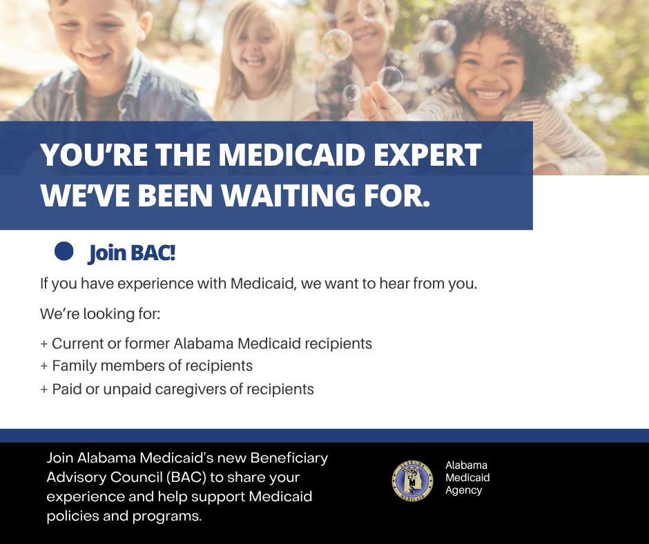 The Beneficiary Advisory Council (BAC) serves in an advisory role to Alabama Medicaid on issues related to health and medical services, as well as policy development. The BAC will be used by Alabama Medicaid to ensure the program operates efficiently and as it was designed to operate.